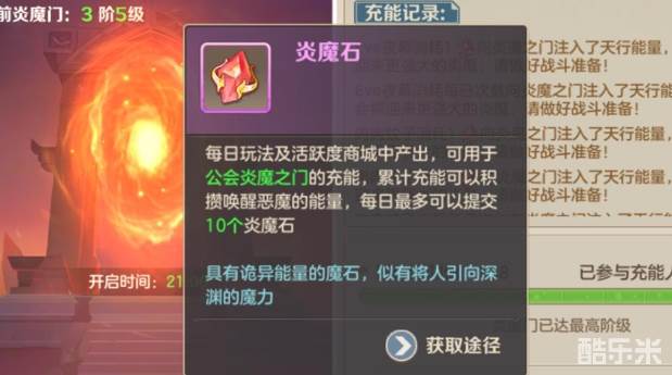 充能消耗的炎魔石,每日每人最高可以提交十个,日常免费可以获取三次充能机会,免费一次,活跃商店可以免费换一个,日常活跃120点可以免费获取一个。