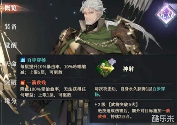 突破技能“神射”则让黄忠每次攻击后都能为自己积累“百步穿杨”效果,最多可以叠加五层,每层提升10%的暴击率和吟唱缩减速度。这样的加成使得黄忠的输出能力不断提升,且技能冷却速度得到有效缩短。在技能的进一步升级中,黄忠还能够对敌方目标施加持续两回合的致残效果,降低目标的治疗效果并封锁增益,使得他在面对敌人时具有较强的控制能力。