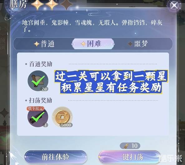 3、每关会分为普通、困难和噩梦,首通需要消耗15体力,扫荡消耗10体力。