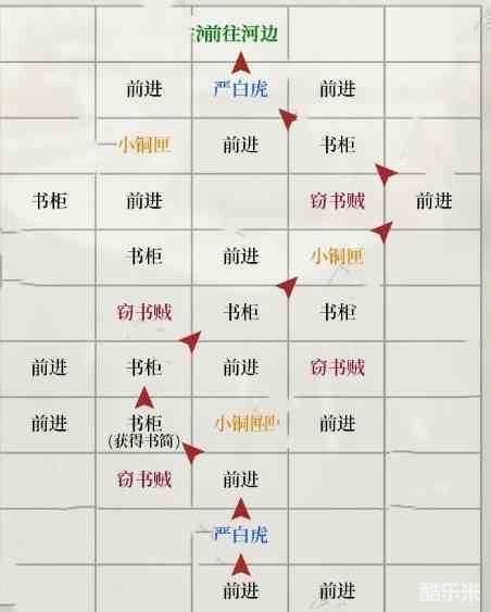 2、藏书阁:前进-严白虎-前进-书柜*3-小铜匣-前进-书柜