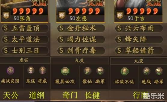 张角需全智力加点,优先保证太平道法的发动率;于吉全统率加点以强化藤甲兵效果;左慈全智力并调整至队伍一速,确保刮骨疗毒及时解控。兵书推荐张角带疾战突围+将威,于吉选临敌不乱+励军,左慈用援其必攻+散仙。