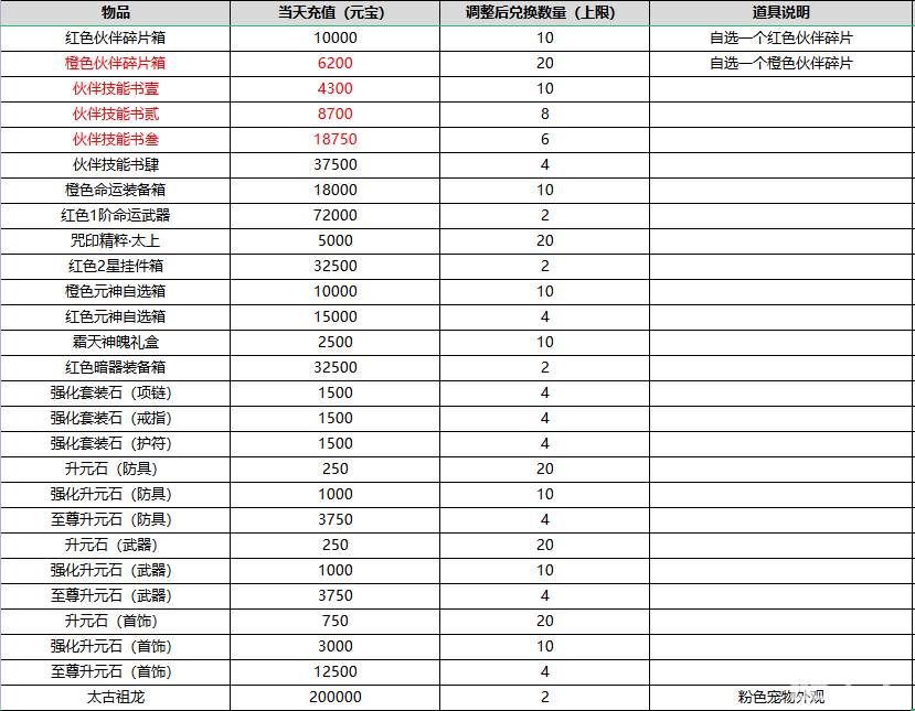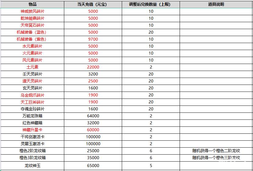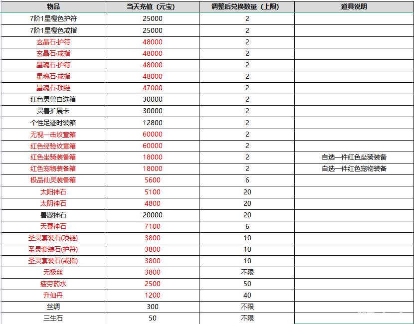 1.按充值元宝计算,活动期间积分可随意兑换任何物品。例如:单日累充10100元宝,5100元宝兑换太阳神石,2500元宝兑换疲劳药水。