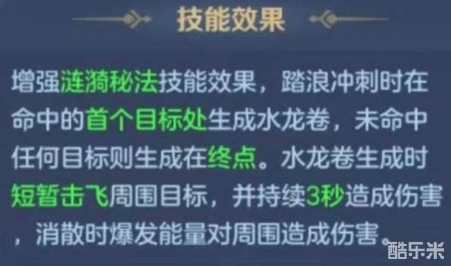 一天赋水月幻形的是命中目标处或者冲浪终点生成水龙卷,水龙卷能短暂击飞周围目标并持续 3 秒造成伤害,消散后还能造成一次爆发伤害。