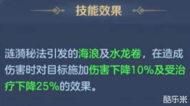 海洋之灵本身技能机制就足够全面无短板,第一天赋水月幻形简单来说就是在海洋之灵技能上额外增加一个水龙卷的效果,这个水龙卷不仅给对手长达10 秒的减攻减治疗,还能持续控制吸附牵扯对手的同时高额百分比减速对手,同时还能提升自身角色攻击输出能力,在实战中的效果还是非常不错的