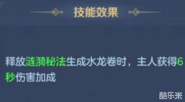 第二子技能生成水龙卷提升主人 6 秒伤害加成,最高 20%,增强主人输出能力。