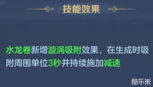 第三子技能漩涡吸附,水龙卷增加吸附效果,周围单位吸附 3 秒并持续增加减速。