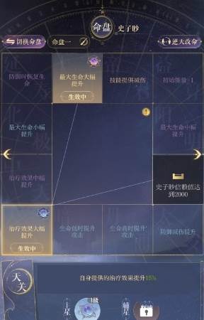 2、装备选择:其他角色正常携带命盘即可,史子眇因风属性而被郭解克制,推荐优先选择最大生命大幅提升和治疗效果大幅提升。