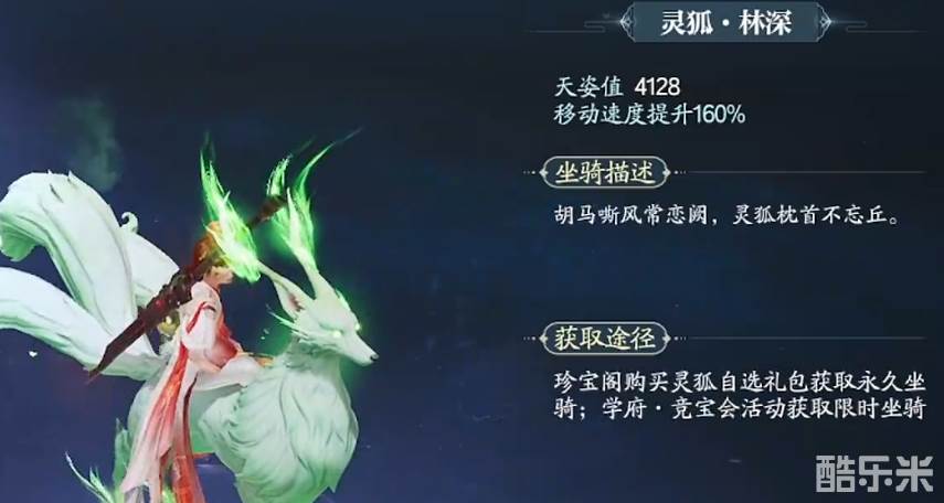 如果你偏爱一些更具灵性和优雅的坐骑,灵狐.林深可能会更符合你的口味。这只绿色的灵狐不仅外形灵动,四肢轻盈,还拥有4128的天资值,飞行速度提升160%。想要获得它的玩家可以通过购买珍宝阁的灵狐自选礼包,或者参与学府风华赏活动,这些途径都能帮助你轻松获得这位灵巧的伙伴。