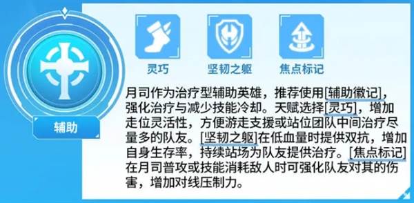 月司作为治疗型辅助英雄,推荐使用【辅助微记】强化治疗与减少技能冷却。天赋选择【灵巧】,增加走位灵活性,方便游走支援或站位团队中间治疗尽量多的队友。【坚韧之躯】在低血量时提供双抗,增加自身生存率,持续站场为队友提供治疗。【焦点标记】在月司普攻或技能消耗敌人时可强化队友对其的伤害,增加对线压制力。