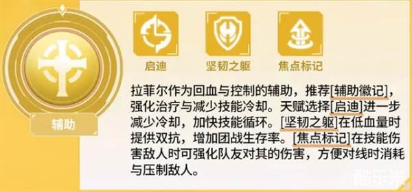 拉菲尔作为回血与控制的辅助,推荐【辅助微记】强化治疗与减少技能冷却。天赋选择[启迪]进一步减少冷却,加快技能循环。【坚韧之躯】在低血量时提供双抗,增加团战生存率。【焦点标记】在技能伤害敌人时可强化队友对其的伤害,方便对线时消耗与压制敌人。