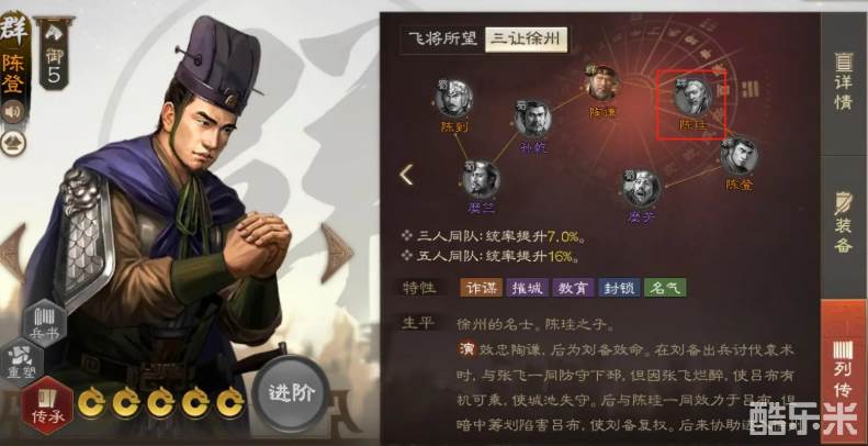 作为“群雄”阵营的武将,他和陈登等其他角色的羁绊能为队伍带来不错的统率提升。三人同队时,统率能提升7%。五人同队时,统率提升16%。尽管陈珪的特性没有橙色技能加成,较为平凡,但他的辅助性质和统率提升的效果,还是能在某些阵容中起到关键作用。