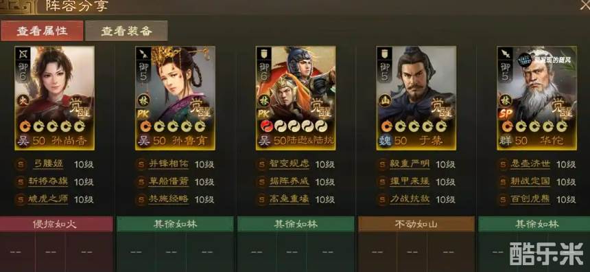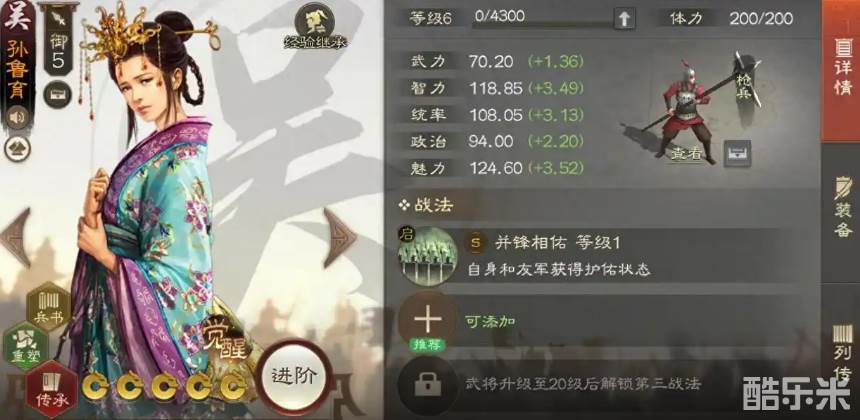 孙鲁育的属性成长相当不错,智力和统率在五御的角色中都算是比较优秀的存在。特别是智力,3.49的成长让她在战场上的辅助效果更上一层楼。别小看了她那样的法师身材,她绝对是一个非常有潜力的存在。更别提她自带的战法【并锋相佑】了,这是一个能够为友军提供超高护盾的核心战法,每回合的护盾叠加能让你在战斗中轻松保持优势。