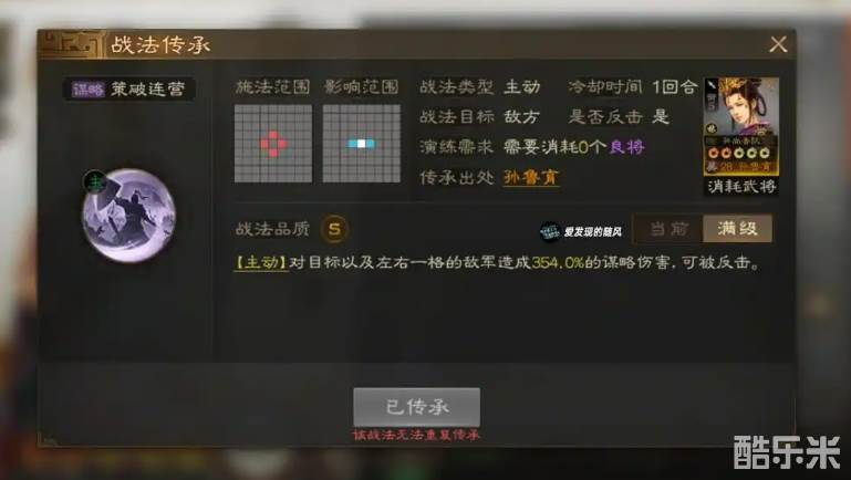 传承战法的部分,孙鲁育带来的【策破连营】也有不小的看点。虽然它是一个1CD的近战谋略伤害战法,伤害的倍率非常高,能够对敌方造成354%的谋略伤害,但是它的应用条件也有点限制——要让敌人排成一排才好发挥威力。