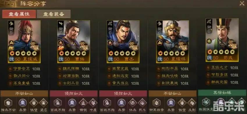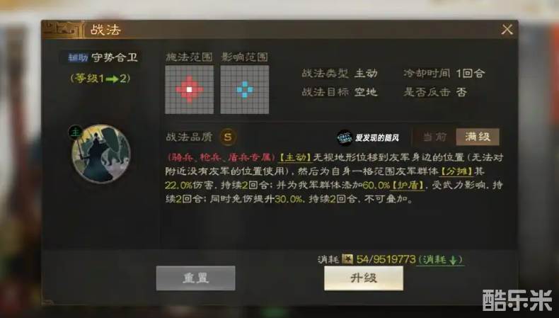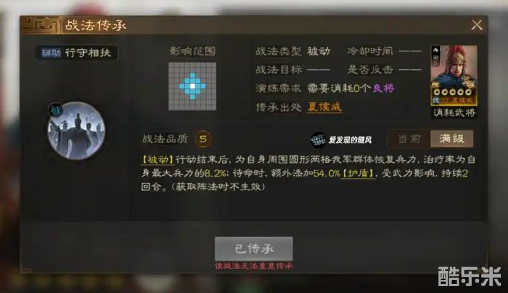 至于他的传承战法【行守相扶】,也有不小的作用。每回合结束后,他会为周围两格范围内的友军恢复最大兵力的8.2%。这个回血效果不算多强,但配合他本身的护盾和分摊效果,可以让队友在战场上站得更稳。而待命时,他还能为自己和周围队友额外加上54%的护盾,这个护盾不仅能让夏侯威的生存能力大大提升,还能让他在待命状态下回到战场时,提供更强的支援。