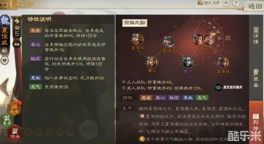 夏侯威的橙色特性“怒发”在友军被击败时提升自身伤害6%,虽然这个特性并不适用于他本身的坦克定位,但也不失为一个小加成。此外,他的柱石特性会在每回合开始时,为自己提供10%的免伤,这个效果在面对高爆发敌人时非常有用。