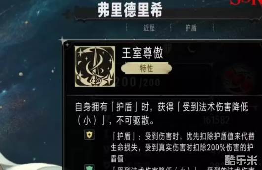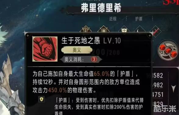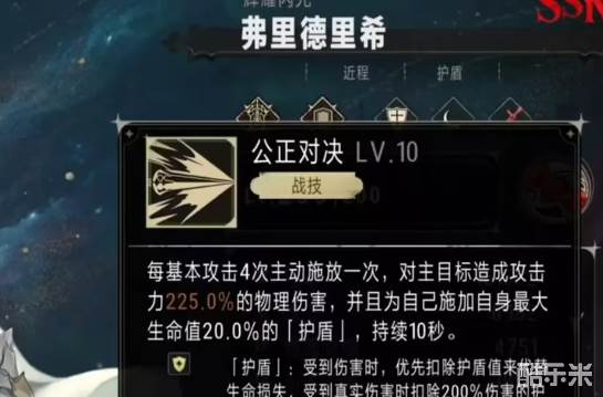 战技每进行4次攻击就可以触发一次,会按照15%的生命值生成一个护盾,持续10秒钟。在护盾持续时,自身的特性王室尊傲,可以提供15%的法术减伤属性,血源爆发能在低血量时提升护盾量。在实战中,弗里德里希就是凭借自身独特的护盾机制和法术减伤特性,可以在团队中承受大量伤害,能够位居目前物理防御型角色的t1梯队。在对抗高爆发法术敌人时,有着非常强的作用,很适合在一些高难度的副本担任主坦,或者是在pvp中充当前排扛压。