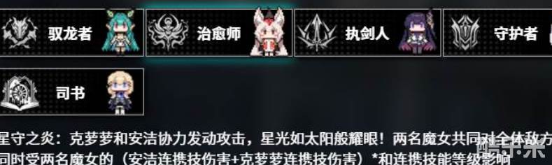 在交叉冲击的特殊效果方面,只要与安洁发起协力一击,便能形成强大的合力效果,两名魔女共同将力量倾泻于全体敌方单位,所造成的伤害值受到多种因素的影响,其中既包括安洁自身的连携技伤害以及其他与之配合的魔女,如律这个角色的连携技伤害,还与双方的连携技能等级相关,例如当克萝萝与安洁携手发动攻击时,会激发出独特的星守之炎效果,她们共同对全体敌方单位展开猛烈打击,伤害计算方式综合考虑了双方的各项属性,使得每一次攻击都充满威力,同样地若安洁与米娅进行组合,也能产生类似的强大效果,两人合力之下效果更强。