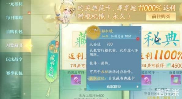 月卡是所有游戏里购买率非常高的,都是因为通过月卡玩家可以获得大量的物品,进入到商城之后就可以看到众多的氪金选项,玩家可以直接去商城找到月览藏书,在这里会有两种不同的月卡,用一个为典藏月卡,玩家只需要花费12元就可以购买,购买之后每天都能获得返利,但这个月卡只有7天的时间,获取月卡之后,玩家的活力上限可以增加,同时塔罗解字的次数也可以增加,玩家还可以获得经验丹和银币的奖励,这些都是可以用来购买道具或者提升角色能力的,这个月卡时间会比较短一些,适合初次尝试课件的玩家。