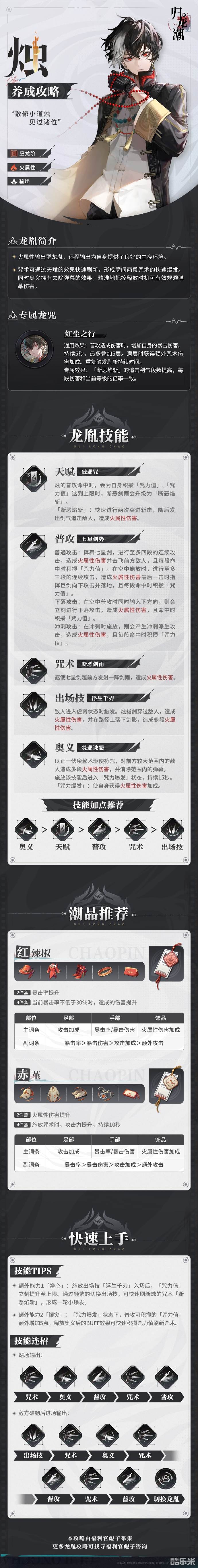 归龙潮有很多的角色内容,玩家可以选择这些角色来开启对战,各种角色的技能都是玩家需要控制的,来了解这些不同的角色来娱乐,来看看游戏里面的烛要怎么养成,很多的玩家还不了解这个角色,也不知道怎么去玩,下面和酷乐米小编一起来看看吧