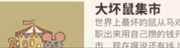 世界上最坏的老鼠从马戏团辞职出来用自己攒的钱开得集市,现在据说还有线上商店,淘宝搜索【大坏鼠集市】试试看。