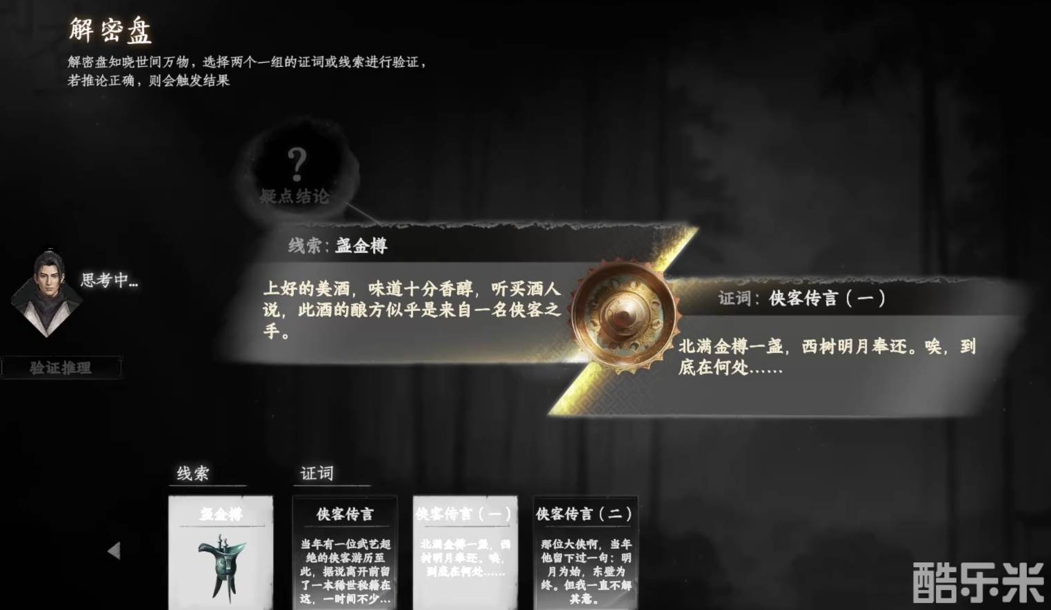 与林褚交谈完后,各位需前往(1979,1278)寻找杂货商,按林褚给的提示在杂货商这里买到盏金樽,然后在解密盘中把盏金樽与侠客传言一结合起来,并在推理结论中选择西树明月,就能推理出线索与城外那颗长得很奇怪的树有关。目标树木的位置在(1899,1232),需有避瘴珠才能前往。把此处的敌人解决后,通过交互用盏金樽浇灌西树,就能拿到最后一个线索物品明月石。
