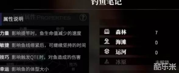 钓鱼的过程中,角色的钓鱼属性发挥着决定性作用。力量、敏捷、技巧、幸运和韧性五项属性,分别对应钓鱼时的不同环节。力量可以加快鱼生命值消耗速度,敏捷影响鱼线绷紧时的持续时间,技巧决定QTE的伤害效果,幸运关系到鱼的体型,而韧性则与鱼线状态的变化速度挂钩。