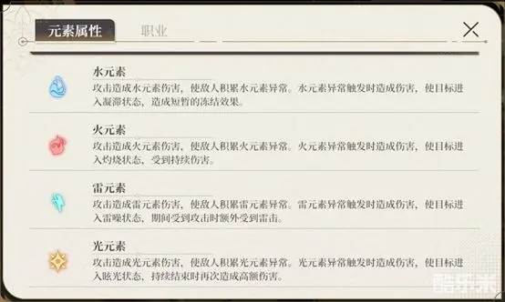 战斗角色根据元素分为5种类型,水、火、雷、光、暗这五种,而在战斗时会遇到各种怪物,这些怪物有不同的元素弱点,可以根据怪物的弱点去选择对怪相应的元素角色,不同元素造成的伤害也有各自的效果加成,只需要搞清楚对应方面的战斗机制,就能对元素方面的配队有一定的思考方向。