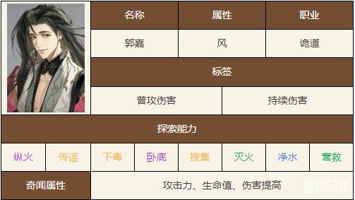 《如鸢》郭嘉是一位风属性的诡道角色,能够造成群体伤害,并使敌人获得易伤buff,非常适合群攻队伍,因此很多玩家都想知道如鸢郭嘉的技能是什么,下面酷乐米小编给玩家们带来了如鸢郭嘉的技能天赋介绍。