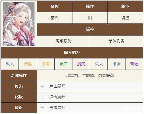 《如鸢》葛洪是一位阴属性的诡道职业,有着出色的探索能力,在战斗中还可以让敌人获得易伤效果,但有的玩家还不知道如鸢葛洪技能是什么,下面酷乐米小编给玩家们带来了如鸢葛洪的技能天赋介绍。