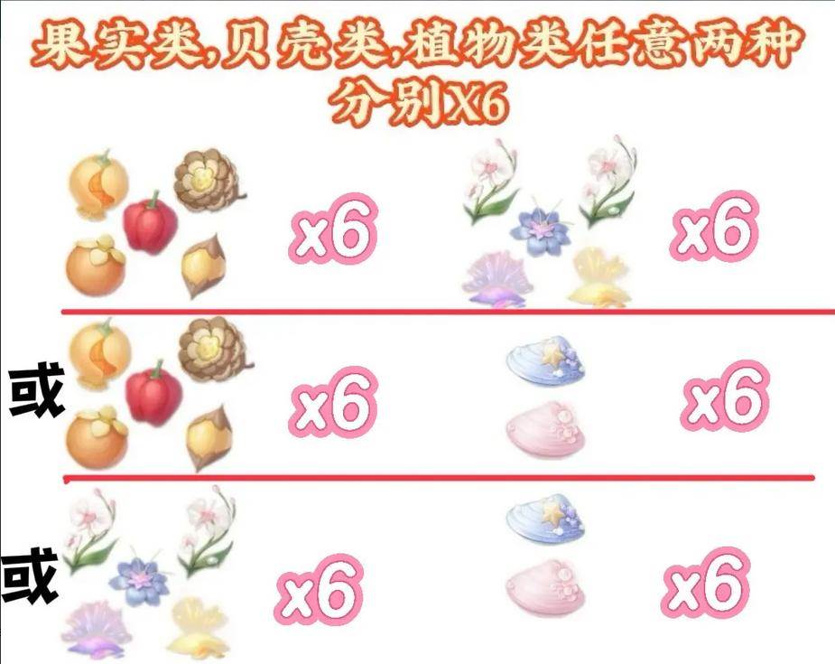 蓝色宴席白牛配方:果实/植物/贝壳,任意2种分别×6。