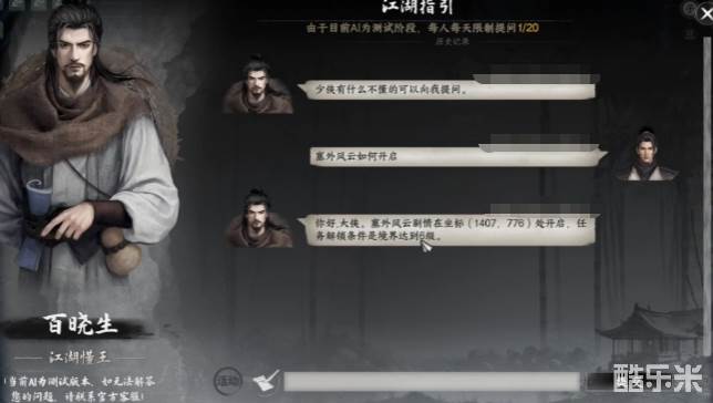 下一站江湖2塞外风云任务怎么做?塞外风云资料片不仅带来了全新的地理场景,更以势力纷争与遗迹探寻为核心,打造了环环相扣的剧情体系与丰富多元的任务玩法,玩家将在黑石镇开启塞外初体验,下面和酷乐米小编一起来看看吧