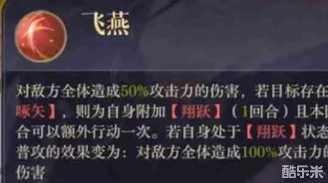 普攻“飞燕”在攻击带有“啄矢”标记的目标时,将激活“翔跃”状态,获得一次额外行动机会。该机制让张燕在一回合内实现多次出手,配合连携技或状态叠加,可形成极具压迫感的连续打击。