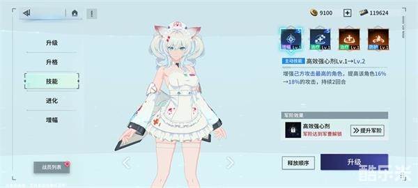 晋升到SSR或本身SSR的战员都开了满技能,技能分为普通技能和怒气技能,普通技能基本两回合可释放一次,在战斗中要选择释放类型,具体看战斗tips。怒气值技能必须要攒满怒气才可释放。每次军衔晋升也就是20一次的晋升,都可以提升技能效果,所以五种培养方式都不能放下,能做就做。