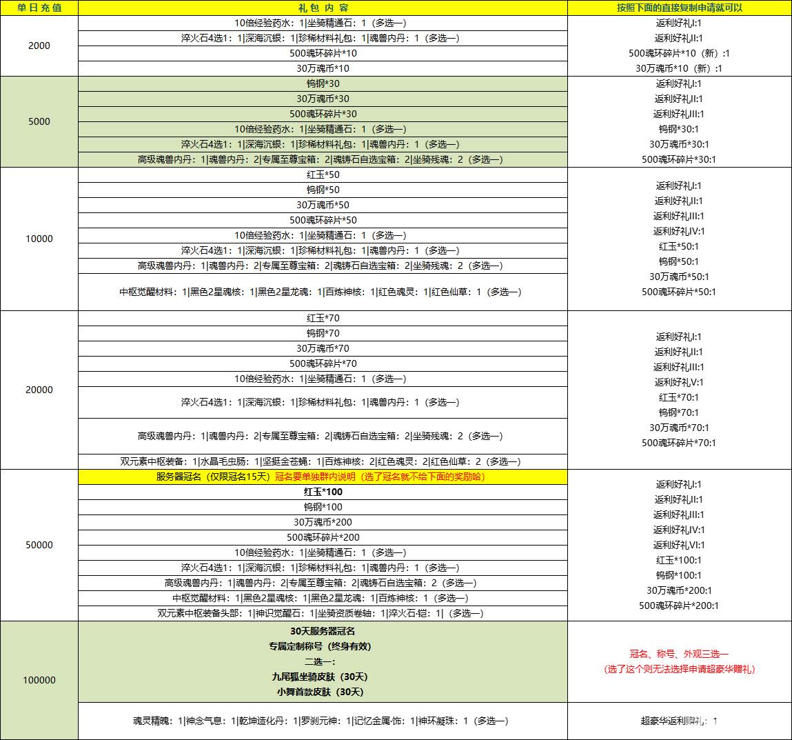 1.充值福利延一个自然日申请(例:1号充值,2号申请;2号充值3号申请以此类推)按提交时最高档位进行返利确认申请,当天充值金额未到不可次日补;单日充值按当天最高档位赠送,也只按照所达到最高档次申请,超出的不能相加