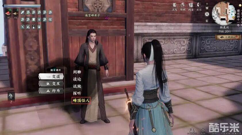 要触发峰顶怪人任务,首先需前往遥雪峰地图坐标(786.2011)。到达该位置后,会看到一名身着棕色道袍的遥雪峰弟子在平台上巡逻,靠近后与其对话即可接取任务。注意此任务无等级限制,但建议先提升轻功等级至3级以上,以便应对后续的地形探索。