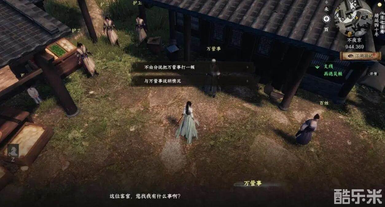 在不夜京御者附近坐标985.374位置,玩家会遇到NPC吴赖。与其对话时必须选择第一个选项,否则无法触发后续任务。对话结束后,根据指引找到万管事,此时会出现战斗或和平两种选择,无论选择哪种方式,最终都需要击败吴赖才能完成任务。建议玩家在接取任务前先存档,以免因战斗失败导致任务进度丢失。