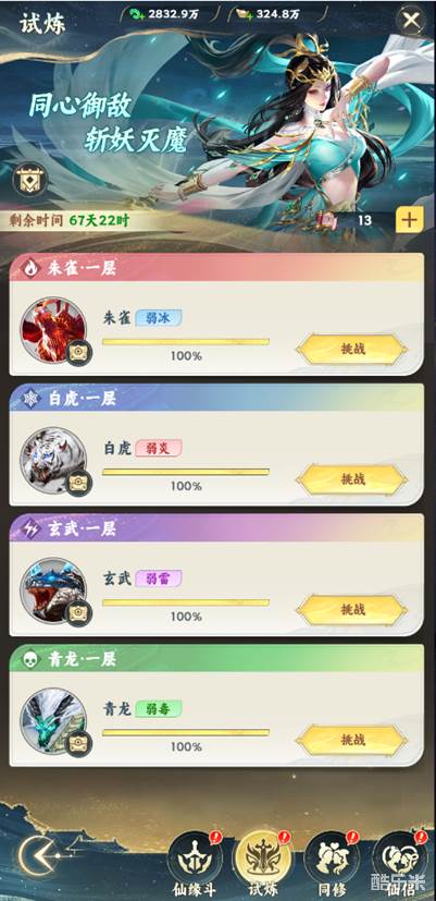 玩家结婚后开启,挑战boss获得挑战奖励,boss打到一定血量可以获得一定的奖励,把boss击败可以获得击败奖励,挑战boss需要消耗道具。试炼有排行榜,排行最高的可以获得更多的排行奖励,排行奖励每周结算一次。