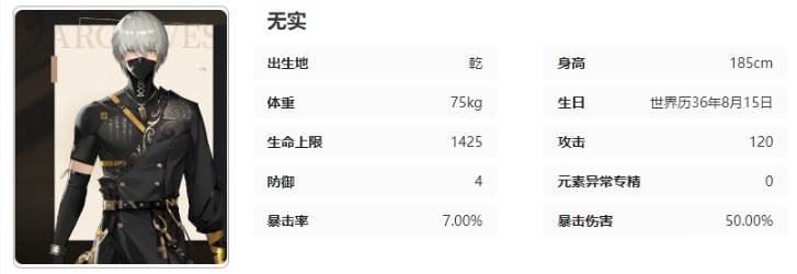 无实,西极域出身,原本为一个小康农家的长子,但在西极域大饥荒中沦为流民,父母死于盗匪之手,而他被恰好路过的“先生”救下,此后便一直跟随“先生”,成为其贴身护卫。无实并不了解“先生”的真实身份由于先生多年来的教导,无实对其忠心耿耿,甘愿为“先生”赴汤蹈火。