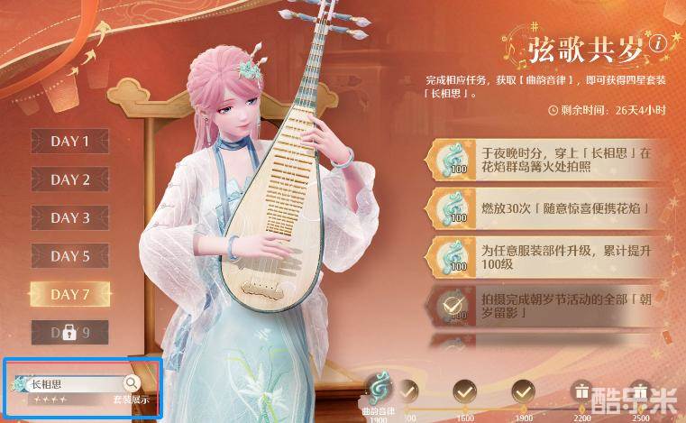 1、长相思就是赠送的琵琶套,完成任务就可以获得