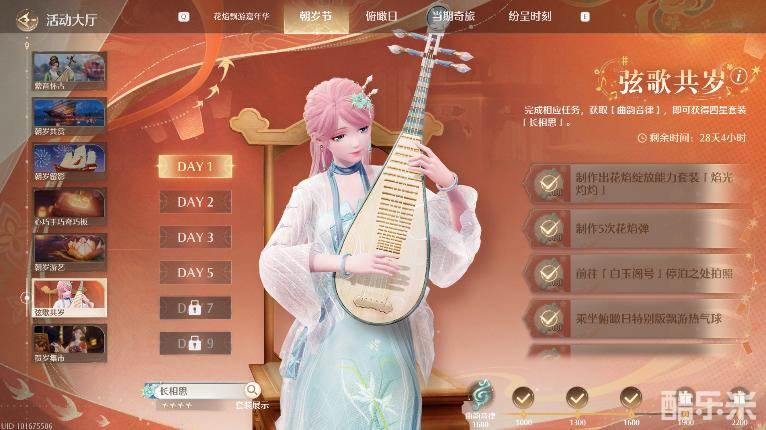 无限暖暖1.2版本活动有一个琵琶套弦歌共岁,弦歌共岁活动期间,每日开放5项目标任务。完成弦歌共岁任务目标,可获得曲韵音律,当曲韵音律达到指定数量时,即可获得【4星琵琶能力套装「长相思1】、【服装设计图:「长相思」】【钻石】等奖励。下面和酷乐米小编一起来看看吧