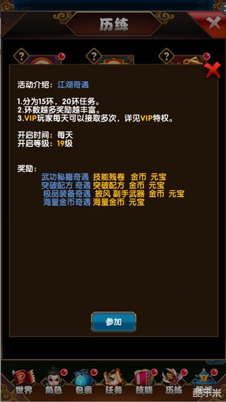 而在《大侠不哭》游戏中,玩家也将有机会通过奇遇任务获得丰厚奖励。玩家每天都可以通过奇遇任务获得奖励。
