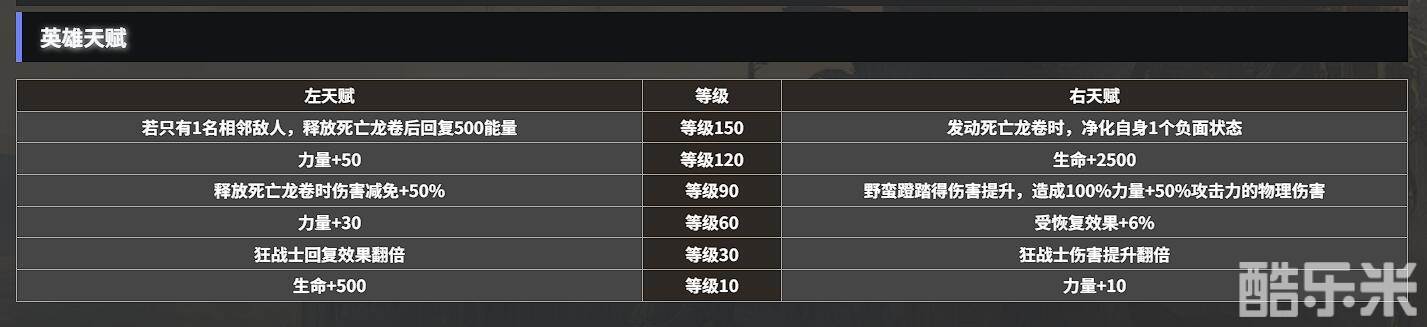 普攻“竖劈”:射程1格,造成45%力量+45%攻击力的物理伤害,无消耗,是能量积累的主要方式(每次普攻回复能量约80点)。能量技“死亡龙卷”:需1000能量、冷却9.8秒,手持巨斧旋转5秒,对相邻目标每秒造成60%力量+45%攻击力的物理伤害,失去目标立即停止。该技能是核心输出手段,配合90级左天赋“伤害减免+50%”可在人群中站桩输出,150级双天赋进一步强化其生存与能量回复。