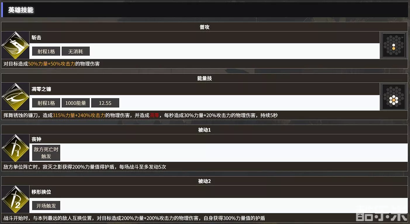 寂灭之影的技能组合非常具有特色。普通攻击斩击是基础输出手段,而核心技能凋零之镰则能造成315%力量加240%攻击的物理伤害,并附加持续5秒的流血效果。这个技能需要消耗1000能量,冷却时间12.5秒,是主要的爆发输出手段。被动技能丧钟让寂灭之影在敌方单位死亡时获得护盾,每场战斗最多触发5次,这个机制很好地平衡了输出与生存能力。最特别的要数移形换位这个被动技能,战斗开始时自动与最远敌方单位交换位置并造成伤害,同时获得护盾,这个技能奠定了寂灭之影的战术定位。
