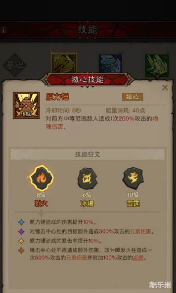 雷旋风技能的基础技能加点,必定要加点原力锤,原力锤的技能符文效果,在命中前方中等范围敌人时, 会造成一次基础攻击倍率为200%的物理伤害,并且在技能升级后,它还能不断的触发狱火、冰锤、雷霆技能,尤其是雷霆技能,可以对锤击中心位置,造成额外的伤害数值,该伤害的提升数值为10%,并且能够提升中心范围的元素伤害300%,可以说是游戏当中,最符合雷旋风技能的一个附属装配技能了。