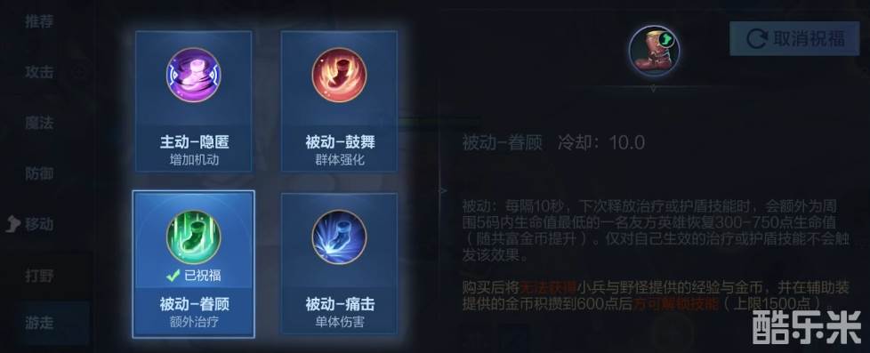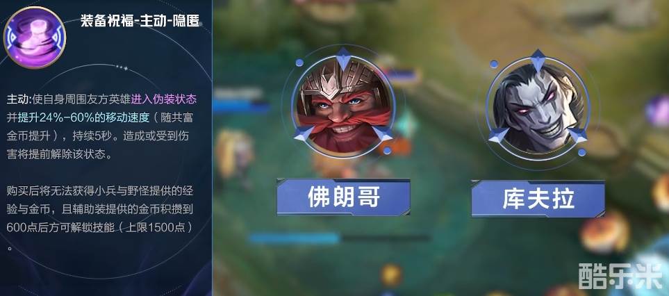 另外一个是主动-隐匿的祝福效果,激活此技能可以让施法者及其附近的盟友暂时处于隐形状态,并在此期间内提高24%至60%的移动速度,具体数值依据当前持有的共富金币数决定,持续时间长达五秒钟,如果在隐身期间受到了任何形式的伤害或者对敌人造成了伤害,则这个效果会立即消失,同样地,为了使用这项强大的能力,玩家必须牺牲掉常规的资源获取途径,直到积累了足够多的辅助专用货币,至少需要600个单位才能开启第一个阶段的能力,最多可以储存达到1500个。