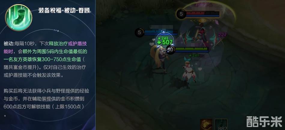 然后是被动-眷顾,每隔十秒钟,下一次施放治疗或者护盾类技能时,将会对范围内血量最少的一位同伴施加相当于三百到七百五十点,也是根据所拥有的共同富裕金币数额而变化的,带来的就是生命回复量的不一样,这一机制特别适用于那些擅长于保护队友免受致命打击的角色身上,然而请注意,如果目标仅仅局限于自身的话,则不会触发上述增益过程,此外与其他几种类型相似地,想要充分利用好此类工具所带来的好处,就需要先达到一定数量级的辅助资金积累标准才行,即最低六百单位起跳,最高不超过一千五百单位为止。