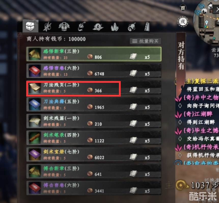 书画商除了在淮陵之外,还有可能在枰栌城(929,769),这里的书画商主要出售的是书戒残页,不过玩家需要注意,如果想要快速的找到枰栌城的书画商,玩家就需要不断的刷新或者说是刷新的次数比较多的时候,他就会出现。玩家如果想要获得的话,可以将其运用在合成高阶武学或者是完成隐藏任务。另外玩家如果在云潇山庄(738,524),这时候想要获得剑术宝册,此时也可以去云潇山庄庄那里寻找到书画商,获得之后,玩家就可以利用它来有效地提升提升剑类武器,并且能够让自己的速度变快。这里需要提醒众多玩家的是如果在云潇山庄,想要购买对应的物品时,玩家要有足够多的金钱。