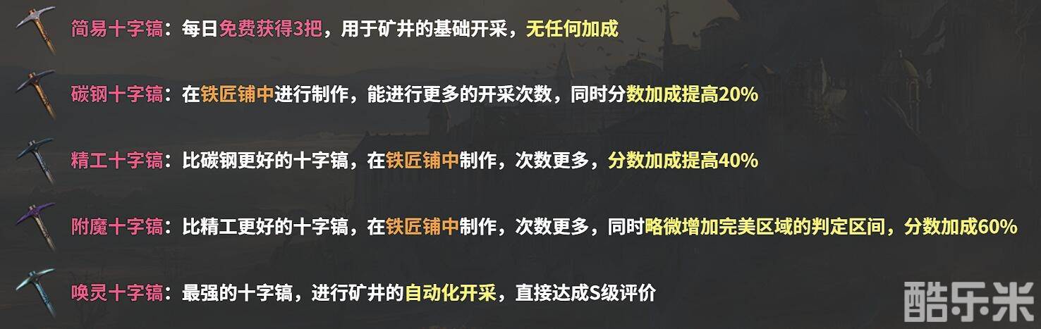 采矿需要使用不同类型的矿镐。系统每天会提供3把简易矿镐,这是最基础的采矿工具。更高级的碳钢矿镐可以在铁匠铺制作,需要20铁和5秘银。最稀有的是精灵矿镐,需要通过活动获得,它能提供100%的积分加成。建议玩家在挑战高难度矿区时使用高级矿镐,平时则用简易矿镐练习。
