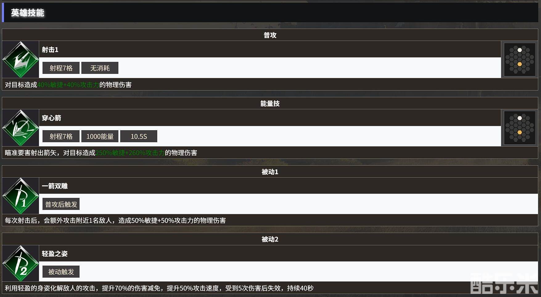 该英雄的技能机制围绕敏捷属性展开。普攻“射击1”射程7格,造成400%敏捷加300%攻击力的物理伤害,无能量消耗,是基础输出手段。能量技“穿心箭”消耗1000能量,冷却10.5秒,可对直线目标造成500%敏捷加250%攻击力的伤害,并穿透至第二个敌人造成50%伤害,BOSS战中需优先释放以确保命中关键目标。被动“一箭双雕”在每次普攻后自动触发,额外攻击1名最远敌人,造成50%敏捷加50%攻击力的伤害;“轻盈之姿”则在受击时激活,提供70%伤害减免和50%攻速加成,持续40秒,但受5次攻击后失效,需通过天赋延长触发次数。