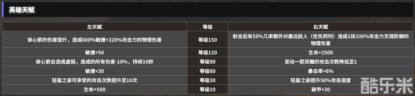 天赋加点分为输出强化与生存辅助两条路线。10级左天赋加生命,右天赋加破甲;30级左天赋可将轻盈之姿承受攻击次数提升至10次,右天赋进一步增加50%攻速;60级左天赋加30敏捷,右天赋加6%暴击率;90级左天赋让穿心箭附加震慑效果(减伤10%),右天赋优化一箭双雕攻击逻辑;120级左天赋加50敏捷,右天赋加2500生命;150级左天赋强化穿心箭伤害至500%敏+320%攻,右天赋让射击后50%概率对最远敌人造成无视防御伤害。加点优先级建议:先点30级左天赋延长轻盈之姿持续时间,再点60级右天赋提升暴击率,之后补90级右天赋优化一箭双雕,最后点150级左天赋强化穿心箭伤害。